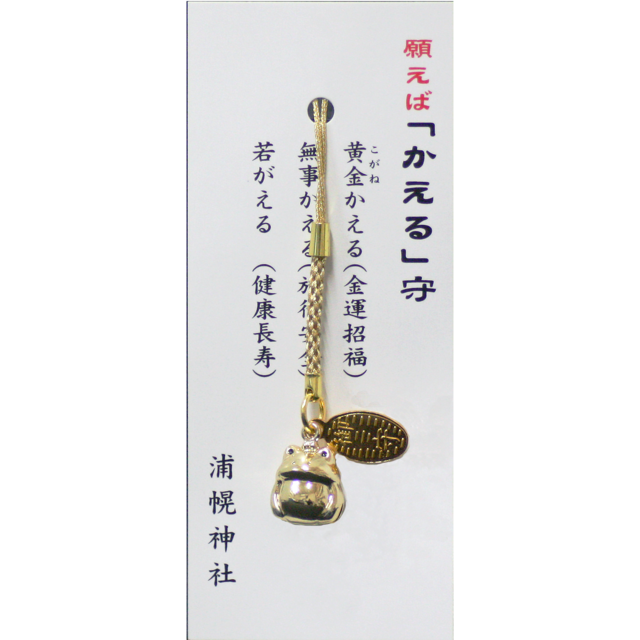 当神社の「かえる守」は、「金色の蛙」に、黄金かえる (金運招福)・無事かえる(交通・旅行安全)・若がえる(健康長寿)を祈願したお守りです。